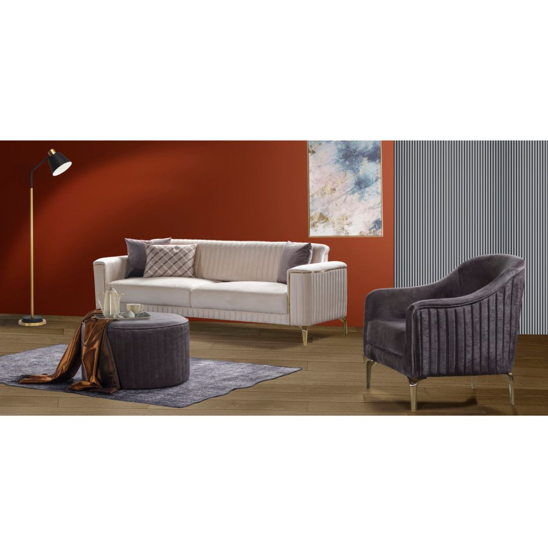 Upgrade your living space with the IMPORT CLASSE/GOLDEN/ CAVALA 3 Piece Lounge Suite, a perfect blend of modern elegance and supreme comfort. This premium set includes a spacious three-seater sofa, a cozy armchair, and a multifunctional ottoman, all designed with a rich velvet fabric for a luxurious touch. The vertical channel tufting on the upholstery adds texture and depth, while the sleek gold-toned legs provide a refined, contemporary appeal. Whether you’re entertaining guests or enjoying a quiet evening, this lounge suite creates an inviting and stylish atmosphere. Ideal for sophisticated interiors, it effortlessly enhances any décor with its timeless charm and high-end craftsmanship.